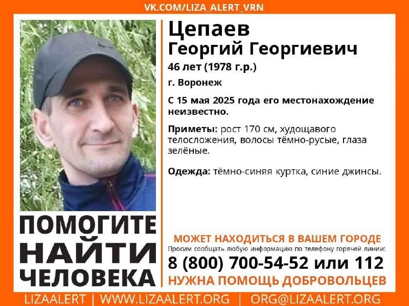 Внимание! Помогите найти человека! Пропал #Цепаев Георгий Георгиевич, 46 лет. г. #Воронеж С 15 мая 2025 года его местонахождение неизвестно. Если вы обладаете какой-либо информацией о пропавшем, просьба позвонить по номеру телефона горячей линии отряда 88007005452 (бесплатно по РФ) или 112. ⚡️Подпишись на «Медиа-Х Воронеж»