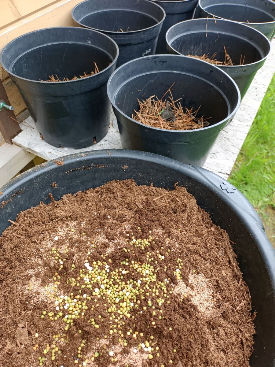 Заготавливаю землю для посадки голубики. На дно горшка щепу хвойную, вместо керамзита, для дренажа. Далее хвойный опад. В моём случае это иголки сосен. Когда в лесу отбор проводим смотрим внимательно что между иголочек имеется. Если есть мох, зелёный маленький такой — это наш вариант. Если его нет, то вполне вероятно могут попасть споры опёнка — это не наш вариант. Третьим слоем пойдёт кислый торф. В него замешиваю микоризу и триходерму. Плюс добавляю осмокот. И уже непосредственно при посадке ростка использую грунт агробалт для голубики. Сажаю в С5 горшки, 5 литров.