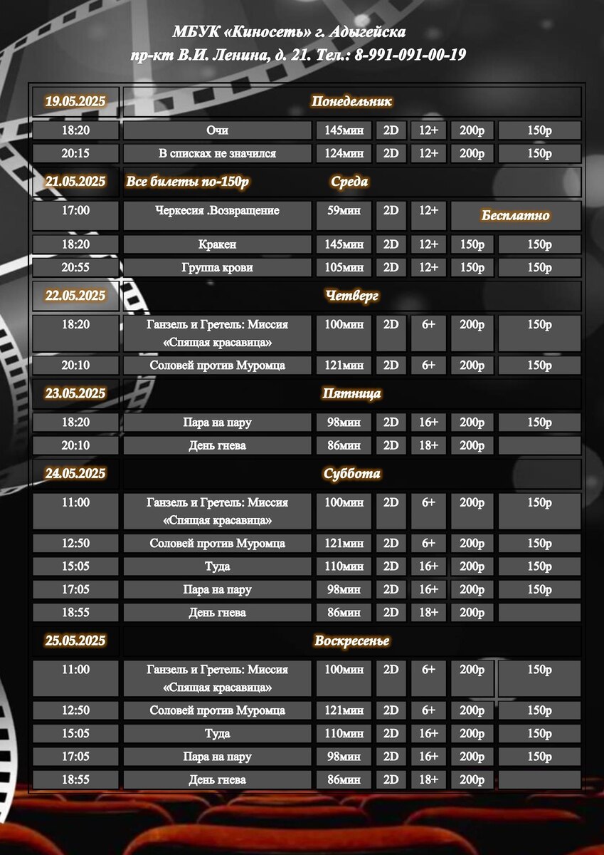Расписание Кинозала г. Адыгейска с 19.05.2025 по 25.05.2025🎞 Купить билет онлайн можно по ссылке внизу 👇 https://clck.ru/32VTgE ___ Мы в социальных сетях: 🎞https://clck.ru/34TuU5 🎞https://clck.ru/34TuU6 🎞WhatsApp: 8-991-091-00-19 📱8-991-091-00-19 Приглашаем влюбляться в кино вместе с нами❤️