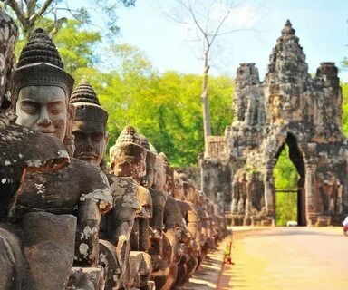 Ангкор-Тхом, одна из величайших архитектурных достопримечательностей Камбоджи. Огромный, внушительный комплекс с надежными укреплениями. Главные ворота, величественные, украшают город. Символизируют вход в царственный мир минувшего. Ворота украшены лицами бодхисаттв, вплетены в легенды.