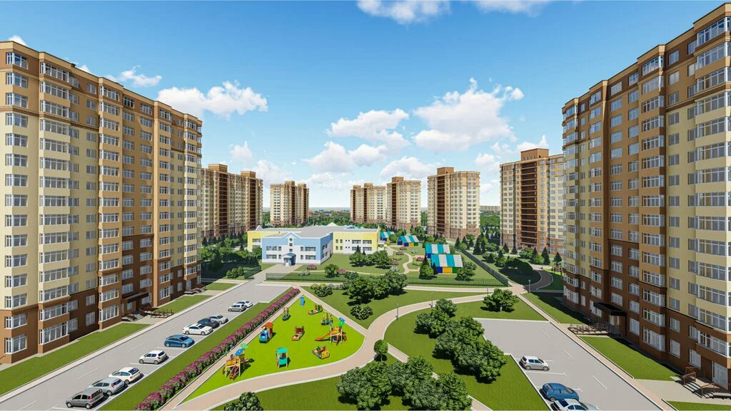 Комплекс состоит из 10 многоквартирных домов с внутренним двором, который закрыт от машин для безопасности и удобства пешеходов.