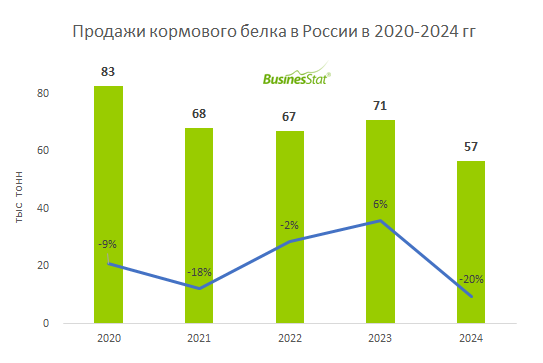 В 2024 г продажи кормового белка в России снизились на 20%: с 71 до 57 тыс т.