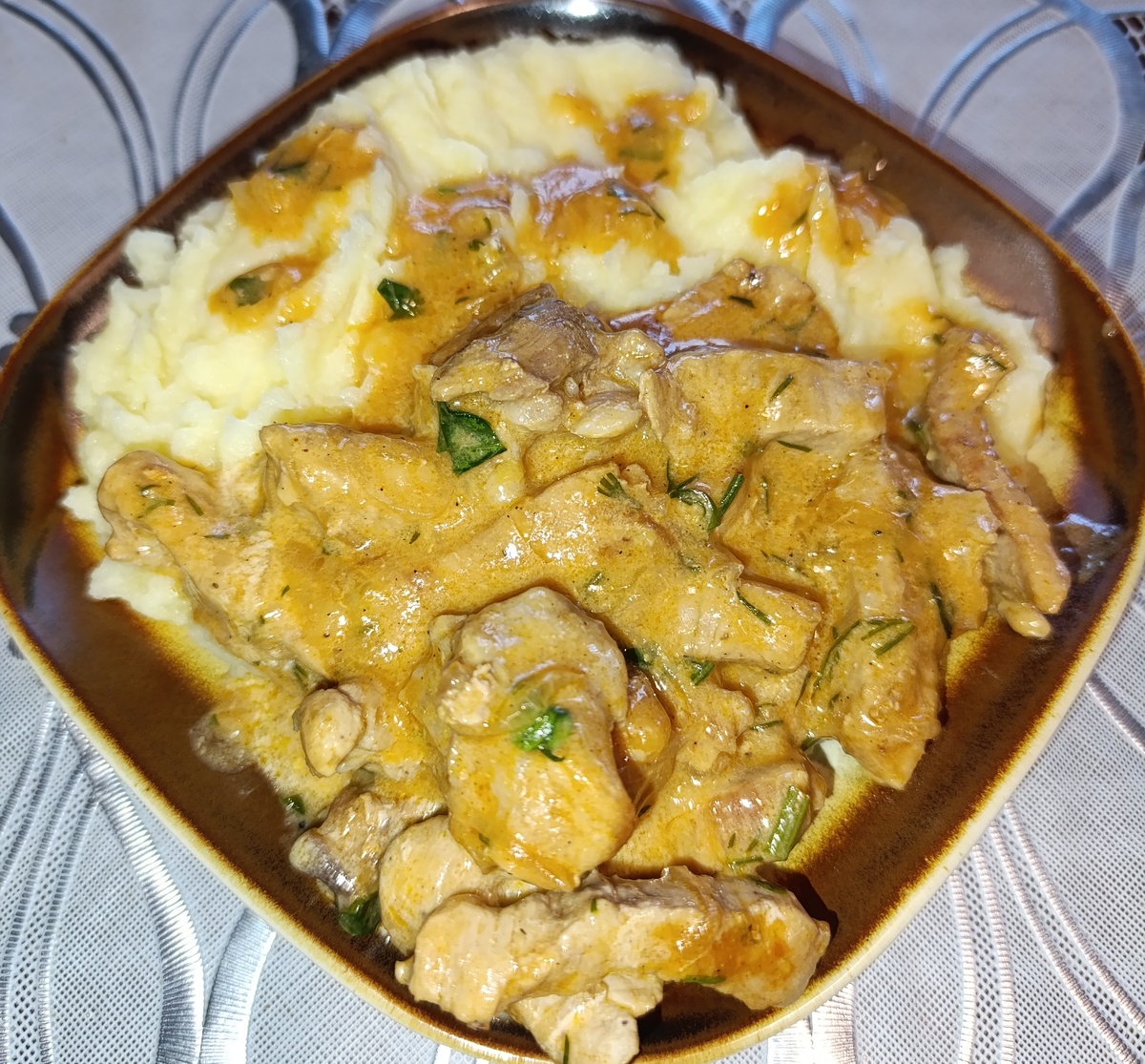 Ингредиенты: мясо 400 гр лук 200 гр сметана 200 гр томатная паста 50 гр молоко 50 гр мука 1 ч л зелень чеснок 2 зубчика соль, перец по вкусу Лук нарезать полукольцами и обжарить. Лук выложить из сковороды. Мясо нарезать полосками и обжарить в сковороде, в которой готовился лук. К мясу выложить лук, добавить томатную пасту, измельченный чеснок. Муку развести в молоке и также добавить к мясу. Тушить 20 минут. Добавить соль, перец, зелень, сметану. Накрыть крышкой и прогреть. Выключить огонь и дать постоять 10 минут. Приятного аппетита!!!!