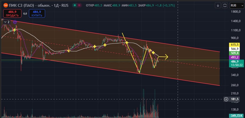 $PIKK 📉Цена идёт в канале на понижение Уже довольно длительное время. 🕯Внутри канала сейчас пытается построить фигуру, Фигура может оказаться, Как разворотной так и продолжением падения. ✔️Фигура пока что не сформирована, поэтому шанс сходить до Нижней стенки 324 всё-таки есть. 📈Канал регрессивный, средний уровень является зеркальным 512, если его пробьёт, тогда шансы построить разворотную фигуру повысятся. Рано брать в лонг НЕ ИИР #теханализ #трейдер #инвестиции #пик