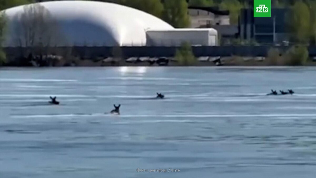 [ Смотреть видео на сайте НТВ ] Жители Перми делятся кадрами массового заплыва лосей по реке Каме. В роликах видно, как семь лосей переплывают реку. Одного из них снесло течением в сторону набережной, а остальные выбрались на берег. В краевом Минприроды рассказали, что случаи, когда лоси переплывают водоемы, случаются ежегодно, но увидеть такой массовый заплыв удается нечасто. Также в ведомстве сообщили, что отбившийся от стаи лось тоже выбрался на берег и вернулся в лес на правом берегу Камы. По материалам: РИА Новости. [ Смотреть видео на сайте НТВ ]