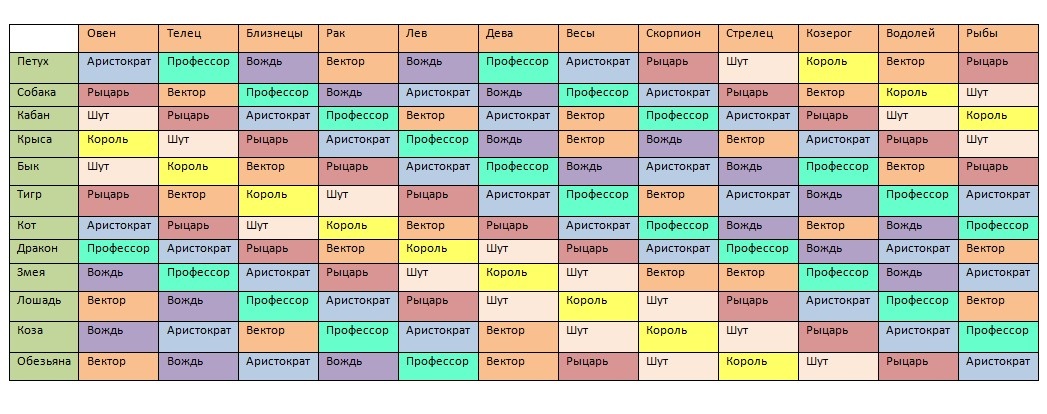 Крыса-Овен, Бык-Телец, Тигр-Близнецы, Кот-Рак, Дракон-Лев, Змея-Дева, Лошадь-Весы, Коза-Скорпион, Обезьяна-Стрелец, Петух-Козерог, Собака-Водолей, Кабан-Рыбы.