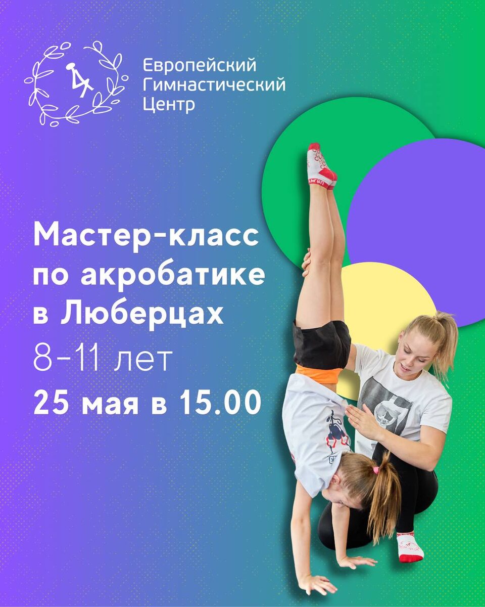 🤸 МАСТЕР-КЛАСС ПО АКРОБАТИКЕ В ЛЮБЕРЦАХ🤸 Приглашаем детей и подростков на мастер – класс по акробатике, который пройдет в Европейском Гимнастическом Центре Люберцы 25 мая! Принять участие могут все желающие с любым уровнем подготовки! На мастер-классе вас ждёт: ✨ Интересное и веселое занятие на батуте, которое проведут профессиональные тренеры – мастера спорта по спортивной гимнастике и прыжкам на батуте; ✨ Безопасное обучение базовым акробатическим элементам на батуте; ✨ Яркие эмоции и новые друзья. Принять участие могут все желающие с любым уровнем подготвки! 📅 25 мая: • 15.00 - возраст 8-11 лет 📌Адрес: Люберцы, Октябрьский пр-т 112, ТЦ «Выходной», 2 этаж. Количество мест ограничено, оставляйте заявки прямо сейчас 👉🏻@Europegym_servicebot
