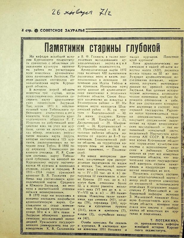 Вырезка из газеты «Советское Зауралье» со статьей Т. Потемкина "Памятники старины глубокой". 1971 г.