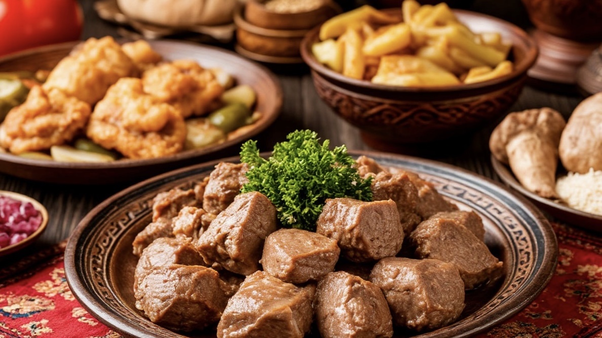 Соленые огурцы нарезать кубиками и положить к луку, затем добавить подготовленные, нарезанные порционными кусками и отваренные отдельно мясо и язык, нарезанную кубиками баранью и конскую колбасу.