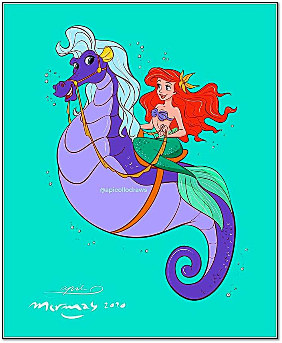 Немецкий художник Алекс Пик (ник - apicollodraws) выбрал любимых диснеевских героинь. Не только принцесс, кстати, мне просто проще так назвать для заголовка. Вместе с любимыми лошадьми изобразил их обитательницами царства Атлантида. Кто смотрел диснеевский мс "Русалочка" сразу узнает эту технику. Ариэль и другие жители перемещались по морскому дню на морских коньках размером с обычных лошадей. Ну, и про бикини в форме ракушек вместо одежды всё понятно. Море обаяния и милоты уже ждут своих зрителей. Приятного просмотра)