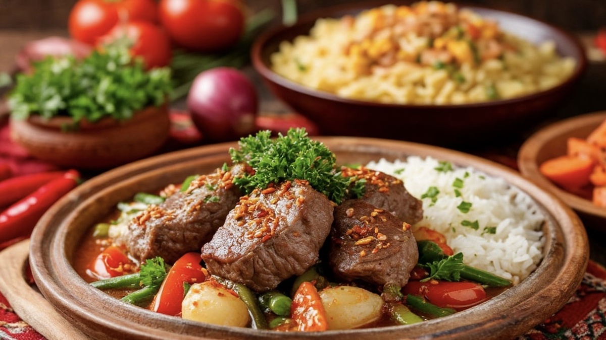 Жарить мясо с салом до готовности, добавив в конце томат‑пасту.