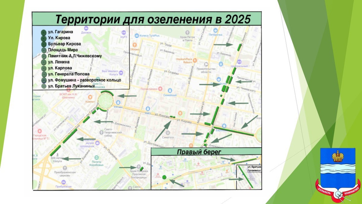 🌳 Калуга готовится к масштабному озеленению: названы первые адреса В 2025 году в Калуге стартует программа комплексного озеленения, которая затронет ключевые улицы и общественные пространства города. Список территорий, где появятся новые деревья и кустарники, 20 мая обнародовал городской голова Дмитрий Денисов. В перечень вошли: центральные магистрали (ул. Кирова, бульвар Кирова, пл. Мира), важные транспортные артерии (ул. Гагарина, ул. Ленина), жилые районы (ул. Карпова, Генерала Попова, Фомушина, Братьев Луканиных) и территория возле памятника Чижевскому. - Пожалуй, впервые в постсоветской истории города мы приступаем к озеленению, учитывая прошлые ошибки, и то, что за десятилетия Калуга сильно изменилась. Поэтому и подход к озеленению будет другим, - подчеркнул Дмитрий Денисов. Особое внимание будет уделено совместимости посадок с инженерными коммуникациями, выбору устойчивых к городской среде растений и трехлетнему адаптационному периоду. Первые результаты горожане смогут оце
