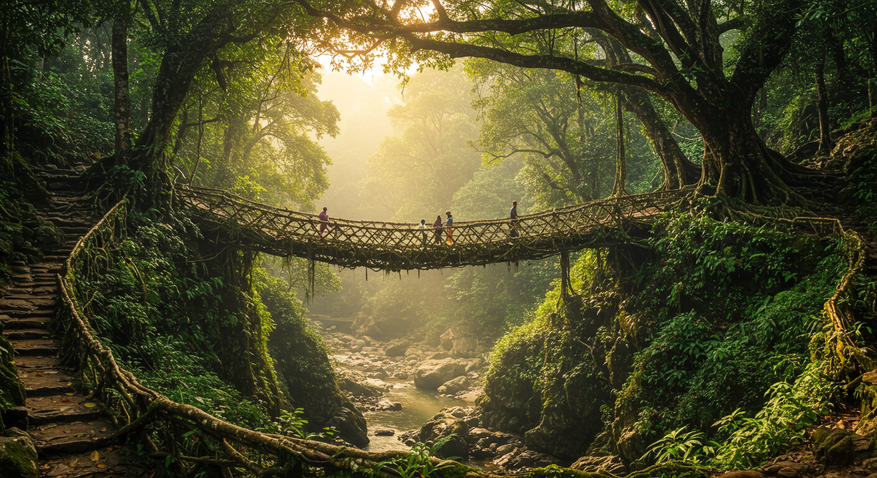 Черапунджи, уютно расположившийся на плато Шиллонг в штате Мегхалая, — место, где природа не знает покоя. Ежегодно здесь выпадает около 12 метров осадков, а в 1861 году был зафиксирован рекорд — 26,5 метра дождя за год. Муссонные потоки превращают реки в бурлящие водопады, а каменистые склоны усложняют жизнь местных жителей — народов кхаси и джантийа. Деревянные мосты в таком климате быстро разрушаются, металл ржавеет, а потоки смывают все на своем пути.