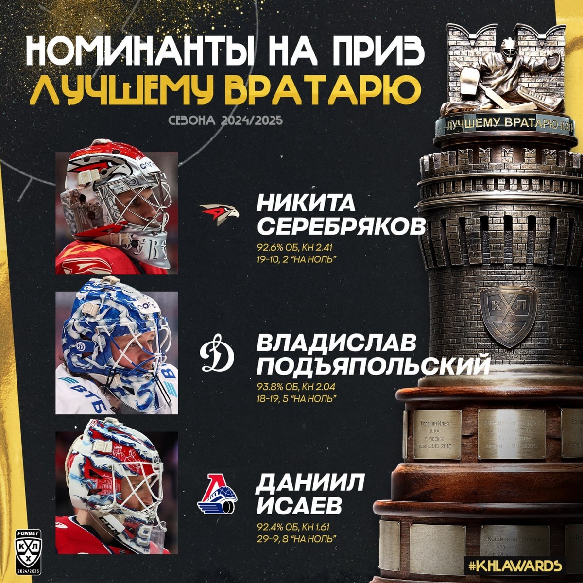 🔝Исаев, Подъяпольский и Серебряков – претенденты на звание лучшего вратаря КХЛ-2024/25