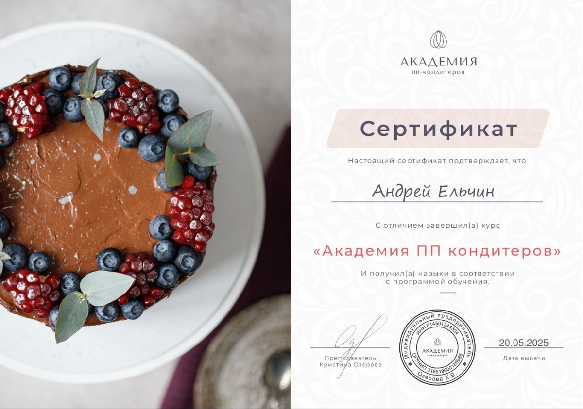 Всем привет 😉 Спешу поделиться приятной новостью, сегодня завершил обучение на курсе в Академии ПП кондитеров. Научился различным техникам приготовления ПП десертов, и узнал много интересных секретных фишек в кондитерском деле. Было очень интересно и вкусно. Дальше буду совершенствовать себя в этом вкусном и полезном направлении, делиться опытом с детьми на занятиях и мастер-классах 😉 Будем готовить красиво, полезно и вкусно! 😋