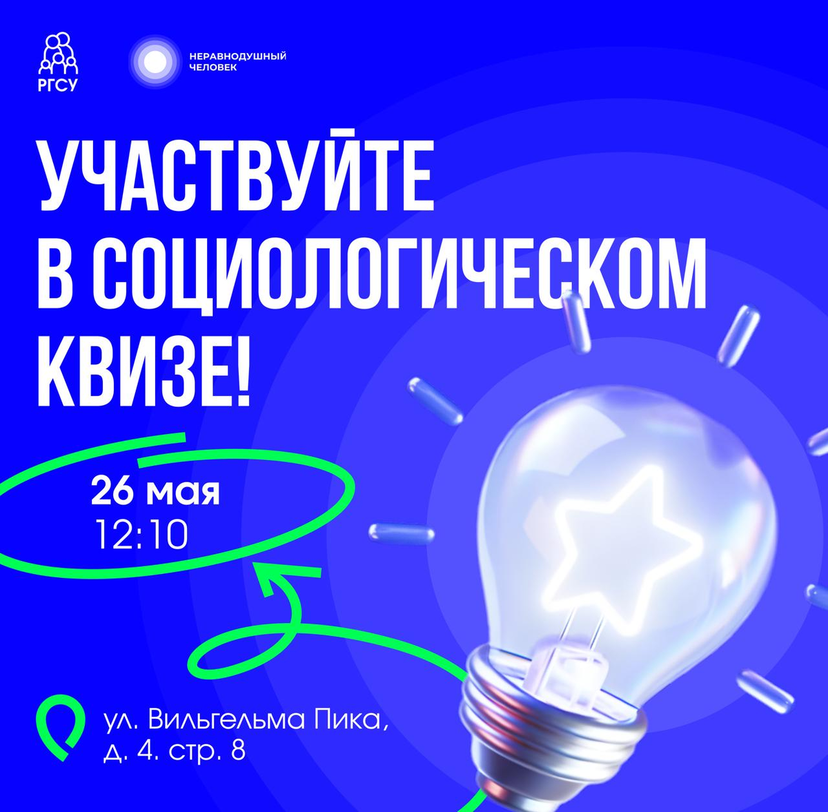 26 мая в 12:10 на ул. Вильгельма Пика, д. 4, стр. 8 пройдет познавательная игра. На ней вы: → узнаете о том, как социологические исследования влияют на общественные и государственные решения; → обсудите роль опросов в принятии общественных решений; → получите полезные подарки. Для тех, кто не сможет попасть на мероприятие очно, будет доступна онлайн-трансляция в группе РГСУ. Присоединяйтесь к ней, участвуйте в квизе и получайте специальные призы! Регистрация обязательна. Узнать больше о платформе «Неравнодушный человек» можно на сайте.