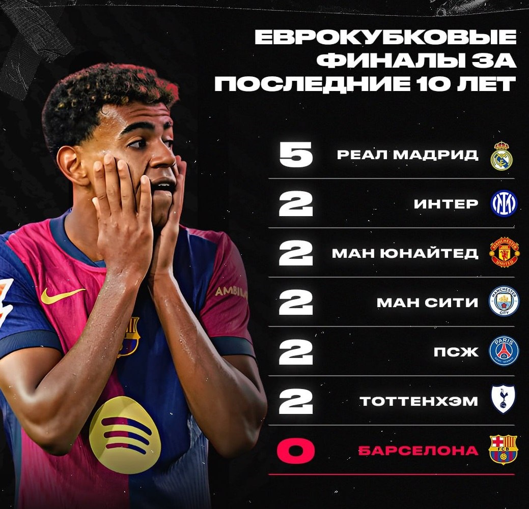 Интересная статистика еврокубковых финалов за последние 10 лет: даже у «Тоттенхэма» два выхода в решающие матчи, а у «Барсы» – 0. По делу или это просто невезение?