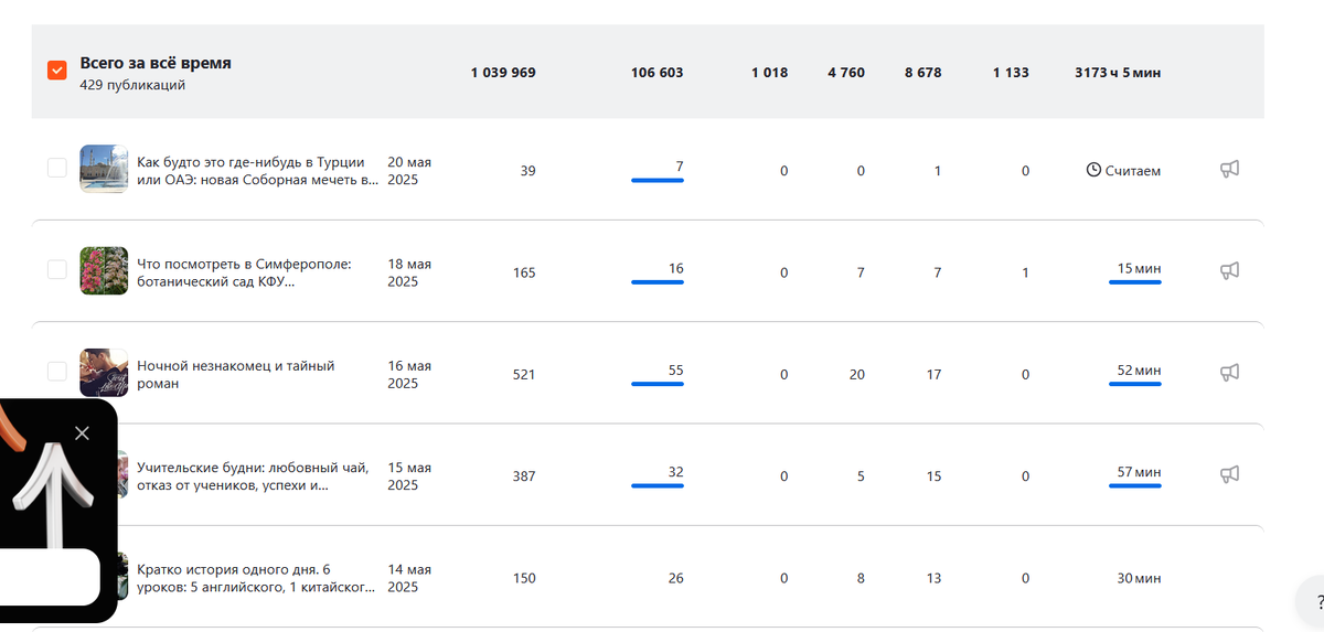 Было написано 429 статей и постов, 1018 людей подписывалось, сейчас подписчиков 821 (это позже прокомментирую), 8678 лайков получено, 1133 репоста было сделано, 3173 часа люди читали мой блог.