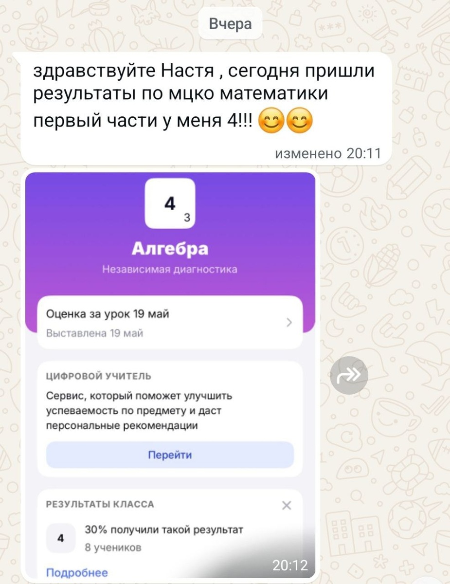С Софией мы занимаемся уже не первый год. За это время она прошла серьёзный путь: от «тройки» по математике — к уверенной «четвёрке», затем — поступление в школу с более сильной математикой, а теперь — "4" за первую часть МЦКО. 🎉