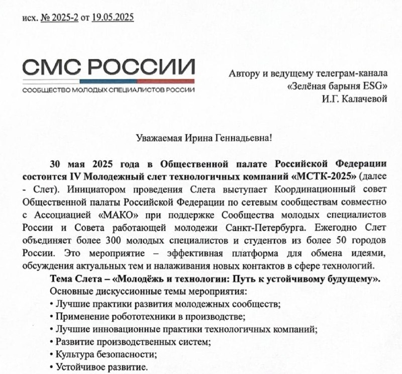 30 мая в 11:15 модерирую круглый стол «Устойчивое развитие» Молодёжного слёта технологических компаний «МСТК-2025» Круглый стол посвящён темам: - Роль молодых лидеров в общей ESG-повестке - Поддержка молодыми лидерами проектов на местах - Эффективный диалог между молодыми лидерами повестки устойчивого развития и руководителями компаний - Уникальные молодежные практики в корпоративной среде, направленные на достижение целей устойчивого развития - Молодой лидер - проводник идей устойчивого развития в корпоративной среде Организаторы: Сообщество молодых специалистов России, Сообщество молодых работников Группы РусГидро, МАКО, Совет работающей молодёжи СПб при поддержке Общественной Палаты РФ. 💚Благодарю организаторов за приглашение! Подробности Зелёная барыня ESG