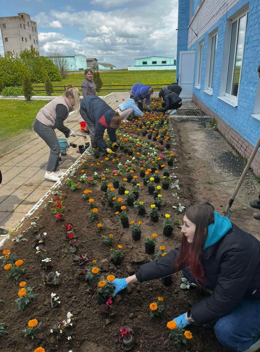 ⚡️Работники ЗАО «Большие Славени» продолжают благоустраивать территорию возле административных зданий. В этот раз они высадили цветы на клумбы. 🌺С каждым посаженным цветком территория становилась все более яркой. А сами работники в процессе благоустройства территории обсуждали, как будут ухаживать за растениями, чтобы они радовали глаз.