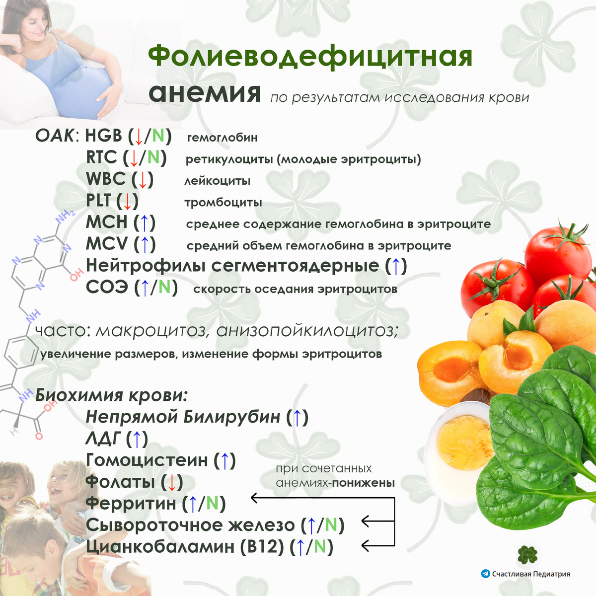 Продолжить серию постов с анемиями хочу статьей о фолиеводефицитной анемии (соло нечасто встречается, но у многих на слуху) В отличие от дефицита витамина В12 истощение запасов фолатов наступает быстро, уже через несколько недель или месяцев с момента появления причины. ( при В12-годы) А наиболее частые причины у детей это: 👉🏻недостаток в рационе сырых овощей; у новорожденных - вскармливание козьим молоком;