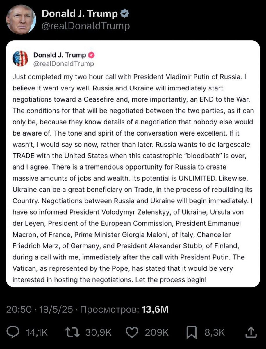 Президент США Д. Трамп: "Только что завершил двухчасовой телефонный разговор с президентом России Владимиром Путиным. Прошёл он, я считаю, очень хорошо. Россия и Украина немедленно начнут переговоры с целью достичь прекращения огня и, что ещё важнее, положить КОНЕЦ войне. Условия будут обсуждаться этими двумя сторонами, как только и может быть, поскольку они знают детали переговоров, никому более не известные. Тон и дух [телефонного] разговора были отличными. Если бы было иначе, я бы сказал об этом прямо сейчас, а не позже. Россия хочет вести крупномасштабную ТОРГОВЛЮ с Соединёнными Штатами, когда окончится эта катастрофическая "кровавая бойня", и я согласен. У России есть потрясающая возможность создать огромное количество рабочих мест и материальных благ. Потенциал у неё БЕЗГРАНИЧЕН. Также и Украина может извлечь большую выгоду от торговли в процессе восстановления страны. Переговоры между Россией и Украиной начнутся немедленно. Я проинформировал об этом президента Украины Владими