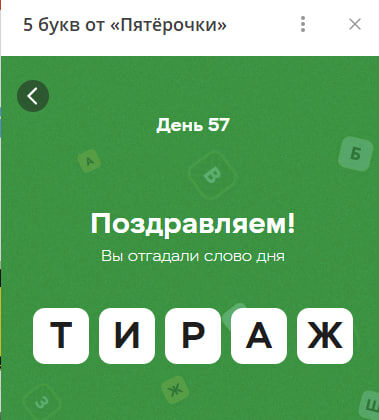 Каждый день «Пятёрочка» устраивает для нас классную игру «5 букв»! Отгадывайте слова и ребусы, набирайте шансы и выигрывайте крутые призы — от iPhone до сертификатов OZON! Сегодняшние ответы: ✅ Правильный ответ — склад ✅ Правильный ответ — тираж