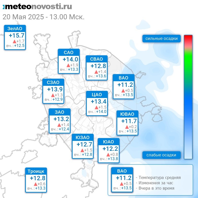 В 13:00 в Москве было от +10.9°C до +16.2°C, средняя температура +13.1°C #погода #Москва #весна #температура #20мая #вторник