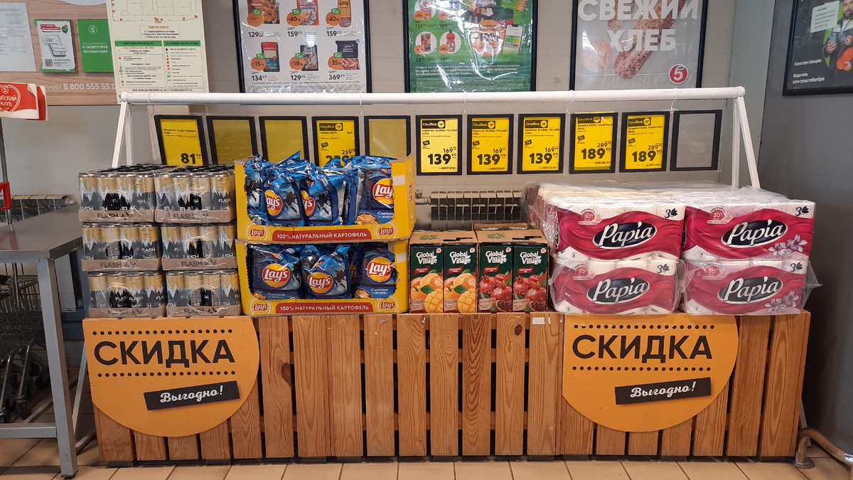 Всех приветствую, мои дорогие друзья и подписчики. В Пятёрочке началась новая неделя скидок с 20 до 26 мая 2025 года. Покажу вам витрину с товарами со скидкой, заглянем в колбасный отдел. И товары у кассы со скидкой. Магазин находится по адресу Ростовская область, Зерноградский район, станица Мечётинская, улица Ленина, 62 Напиток Flash Energy 0.45 л безалкогольный энергетический ж/б цена 81.99 руб. Чипсы Лейс картофельные сметана и зелень 225 г цена со скидкой по карте 229.99 рублей. Напиток Global Village сокосодержащий в ассортименте 1,93 л цена со скидкой по карте 139.99 руб. Бумага туалетная Papia 3х-слойная 8 рулонов в ассортименте цена со скидкой по карте 189.90 рублей. Фарш Мираторг домашний свино-говяжий 400 г цена со скидкой по карте 179.99 рублей. Шашлык Слово Мясника отборный из свинины без кости категория Б охлажденный 1 кг цена 369.99 рублей. Окорок свиной без кости охлажденный 1 кг цена со скидкой по карте 289.99 руб. Сыр плавленый Свежий ряд Янтарь 45