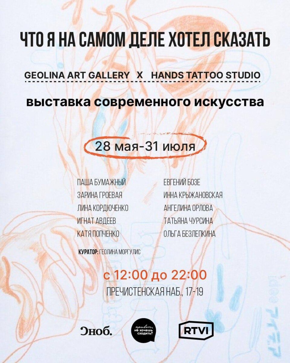 28 мая галерея современного искусства Geolina Art Gallery представляет новую выставку «Что я на самом деле хотел сказать», которая пройдет в пространстве аутентичной тату-студии Hands, расположенной в переулках Остоженки. Проект «Что я на самом деле хотел сказать» исследует взаимосвязь между телом и искусством в контексте татуировок. Здесь татуировки воспринимаются не только как формы самовыражения, но и как важные элементы культурного кода. Художники, участвующие в выставке, используют различные подходы, чтобы исследовать символику и значение татуировок в жизни человека. В экспозиции представлены работы резидентов Geolina Art Gallery, среди которых: Игнат Авдеев, Ольга Безлепкина, Паша Бумажный, Зарина Гроевая, Лина Кордюченко, Инна Крыжановская, Ангелина Орлова, Катя Попченко, Татьяна Чурсина, Евгений Boze. Все они работают в разных медиумах и представят живопись, скульптуру и графику. ▪️адрес: Hands Tattoo Studio, Пречистенская набережная, 17-19 ▪️вход свободный ▪️до 31 июля вклю