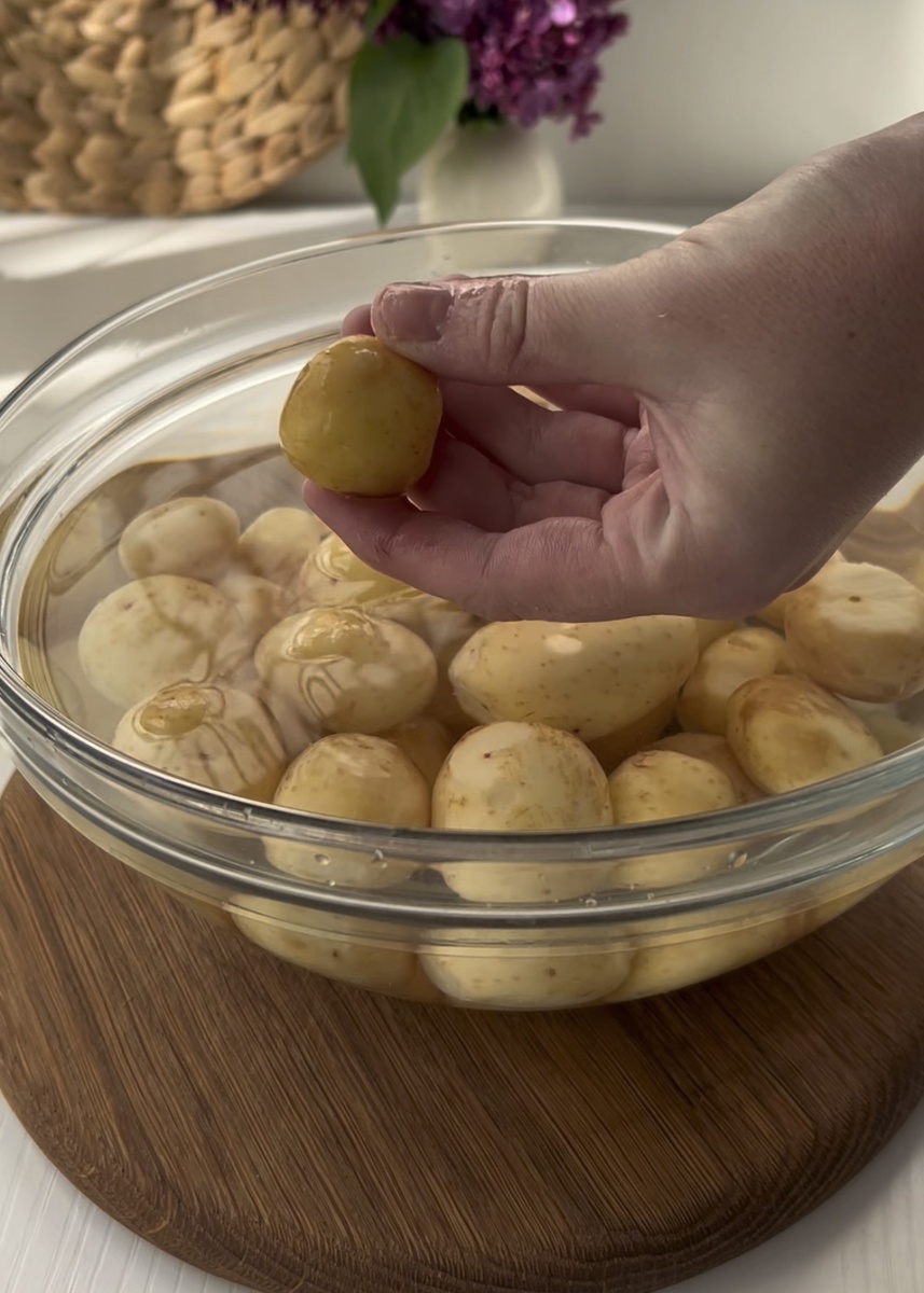 Первое и главное: для этого рецепта нам нужен молодой картофель. Самый-самый свеженький, маленький, с тонкой кожицей. Знаете, такой, что даже чистить не хочется и, спойлер, не нужно! Только выбирайте картошку помельче. Если попались чуть крупнее ничего страшного, просто разрежьте пополам.