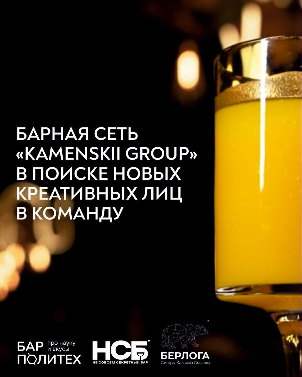 Самая творческая и новаторская барная сеть «KAMENSKII GROUP» находится в поиске новых креативных лиц в команду🙌🏻 «KAMENSKII GROUP»включает в себя барный хаб из трех заведений: ✔️ Миксологический бар «НСБ» ✔️ Научный бар «Политех» ✔️Сигарный клуб «Берлога» ▫️«KAMENSKII GROUP» — это про свежий взгляд на барную индустрию, где команда воспринимает «гостеприимство» как свою миссию. ▫️KAMENSKII GROUP — это про самобытность, уникальность и изобретательность, каждый сотрудник нашей сети — по-своему гениальная личность. ▫️В связи с расширением команды мы открываем поиск новых кадров в проекты. Если хочешь стать частью нашей команды, то пиши нашей Ане – HR-специалисту. +79931076764 (телефон) +79041676764 (WA) @SHCHERBAKOVA_ANN1 (TG) Ждём тебя в команде🤍