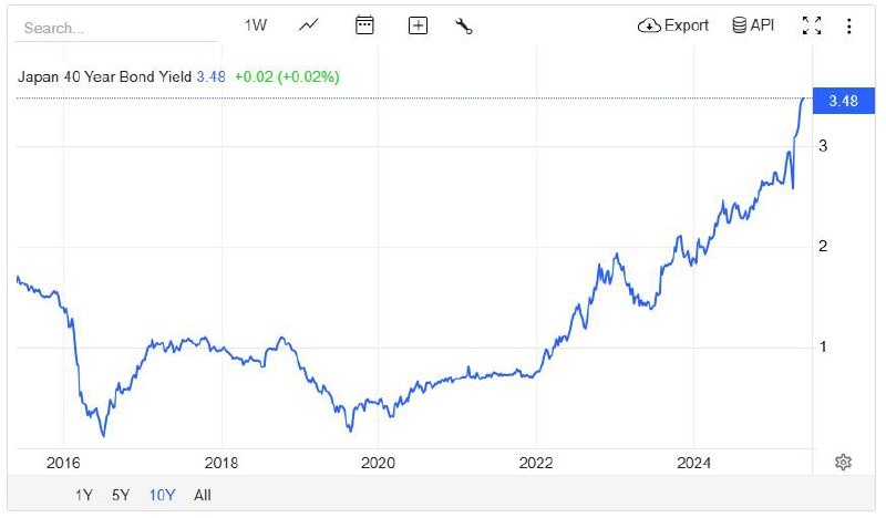 Когда Япония чихает — трясёт весь рынок Вы же помните, что Япония десятилетиями была королём “нулевой ставки”? Там, где весь мир бегал от инфляции, они боролись с дефляцией. Ставки в нуле, доходности — как у подоконника. Все привыкли. Все расслабились. А теперь смотрим на график: доходность 40-летних облигаций Японии — 3.48%. Так высоко не было два десятилетия. Что это значит? Это значит, что даже Япония, самая терпеливая в мире, больше не выдерживает. Деньги становятся дороже. Рынки начинают требовать плату за риск. Причём не где-то в развивающейся стране — а в стране, где ставки стояли мёртво десятки лет. Почему это опасно? Потому что Япония — это системный игрок. Это: • крупнейший держатель американского долга, • крупнейшие пенсионные фонды с длинной дюрацией, • крупнейшие банки, привыкшие жить в мире нулевых ставок. Если ставки продолжают расти — будет больно всем, не только Японии. Они начнут продавать активы. Закрывать позиции. И всё это может вызвать цепную реакцию. Особ