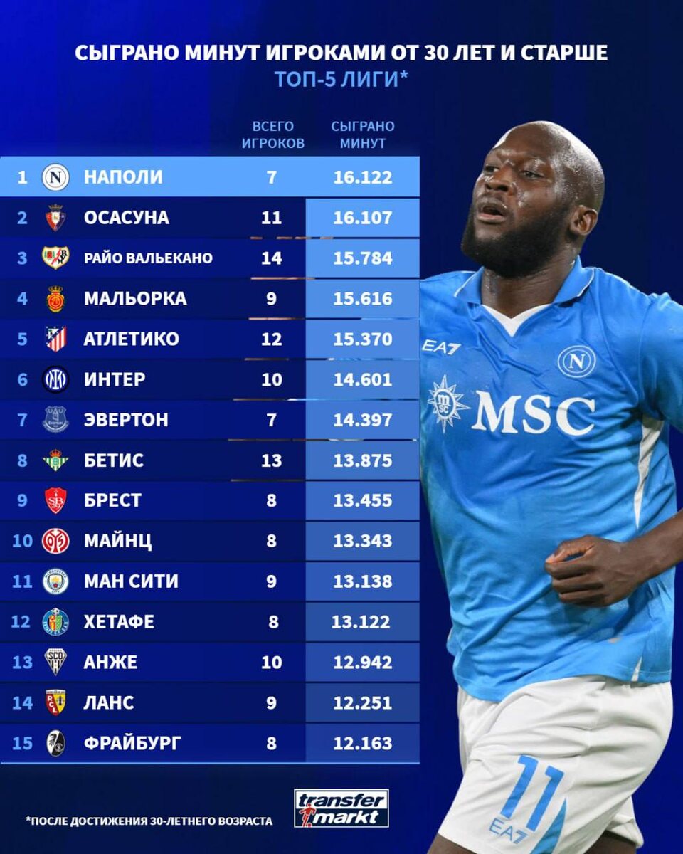 Клубы из топ-5 лиг Европы, которые чаще всего задействуют игроков от 30 лет и старше в сезоне 2024/25. Из всего списка только одна команда станет чемпионом: это будет или Наполи или Интер. Но удивительно, что от итальянского чемпионата тут всего 2 команды, так как именно они славятся долголетием своих игроков.