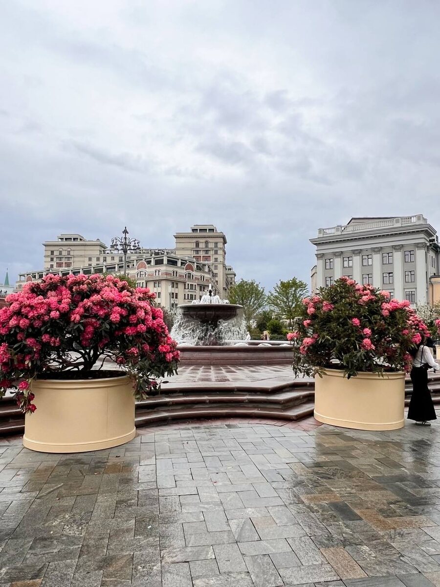 Театральная площадь Фотографии сняты с одной точки, в четыре разные стороны: 1. Цветущие рододендроны на фоне фонтана и гостиницы «Москва» 2. Большой театр в буйстве зелени 3. Готический ЦУМ 4. Сирень на фоне гостиницы «Метрополь» отсылает нас к знаменитой картине Михаила Врубеля «Сирень» и, как бы, перекликается с его «Принцессой Грёзой» - главным украшением «Метрополя» Люблю фотографировать Москву в пасмурную погоду. Свет и цвет находятся в абсолютной гармонии. Отсутствуют тени и изображение получается мягким, приятным. А вам как больше нравится? Яркие и солнечные фото города или приглушённые?