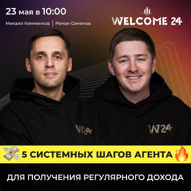 🔥 Уже в эту пятницу в 10:00 — вебинар, который меняет мышление 📆 23 мая, 10:00 📍 В нашем Telegram-канале 🎙 В прямом эфире — Роман Семенов, сооснователь и партнер WELCOME 24 совместно с генеральным директором WELCOME 24 Михаилом Клименковым 👉🏼Тема: «5 системных шагов агента для получения регулярного дохода» Без ненужной информации, только структура, которую можно взять и применить сразу же: ✅ Как агенту перестать зависеть от везения и хаотичных сделок ✅ Что должно быть в ежедневной рутине, чтобы деньги приходили предсказуемо ✅ Где теряется прибыль и как это закрыть Вебинар про то, как наводить порядок в действиях и стабильно развивать агентский бизнес 😎 Отмечайте в календаре и подключаетесь, будет интересно🔥
