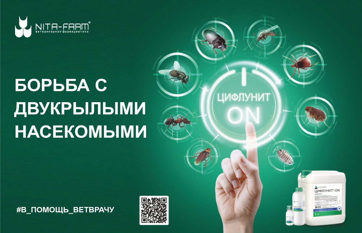 В связи с этим в Компании НИТА-ФАРМ было разработано инсектоакарицидное средство нового поколения – «Цифлунит-ON» с широким спектром инсектицидного действия. Основным действующим веществом данного средства является цифлутрин – улучшенный пиретроид нового поколения, вызывающий паралич и гибель насекомых без вреда для организма продуктивных животных.