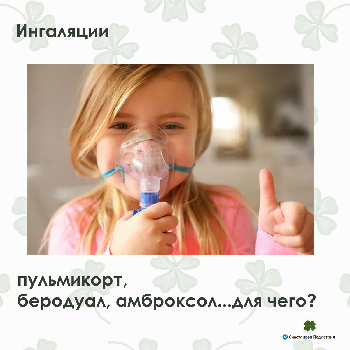 ингаляции при кашле 💨 В этом посте хочу затронуть три самых популярных препарата, которые используются в педиатрической ингаляции, и внести ясность, а зачем они вообще нужны. 🔹Пульмикорт (будесонид) 🔹Беродуал (фенотерол/ипратропия бромид) 🔹Лазолван/Амбробене (амброксол) Пульмикорт. Что это❓ суспензия глюкокортикоида. Зачем нужен ❓ При ингаляционном применении оказывает противовоспалительное, противоаллергическое и антиотченое действие, которое приводит к уменьшению бронхиальной обструкции, спазма в трахее и глотке. А также в носу (если дышать через маску) То есть он действует на протяжении всей слизистой дыхательных путей. Беродуал Что это ❓ комбинация бронхолитиков. Зачем нужен❓ Состоит из 2х веществ поэтому рассмотрим каждое. Ипратропия бромид -действует исключительно на м-холинорецепторы в бронхах и расширяет их. Есть данные, что угнетает секрецию желез (уменьшение мокроты) Фенотерол-действует преимущественно на β2-адренорецепторы в бронхах и тоже расширяет их. Беродуал действ