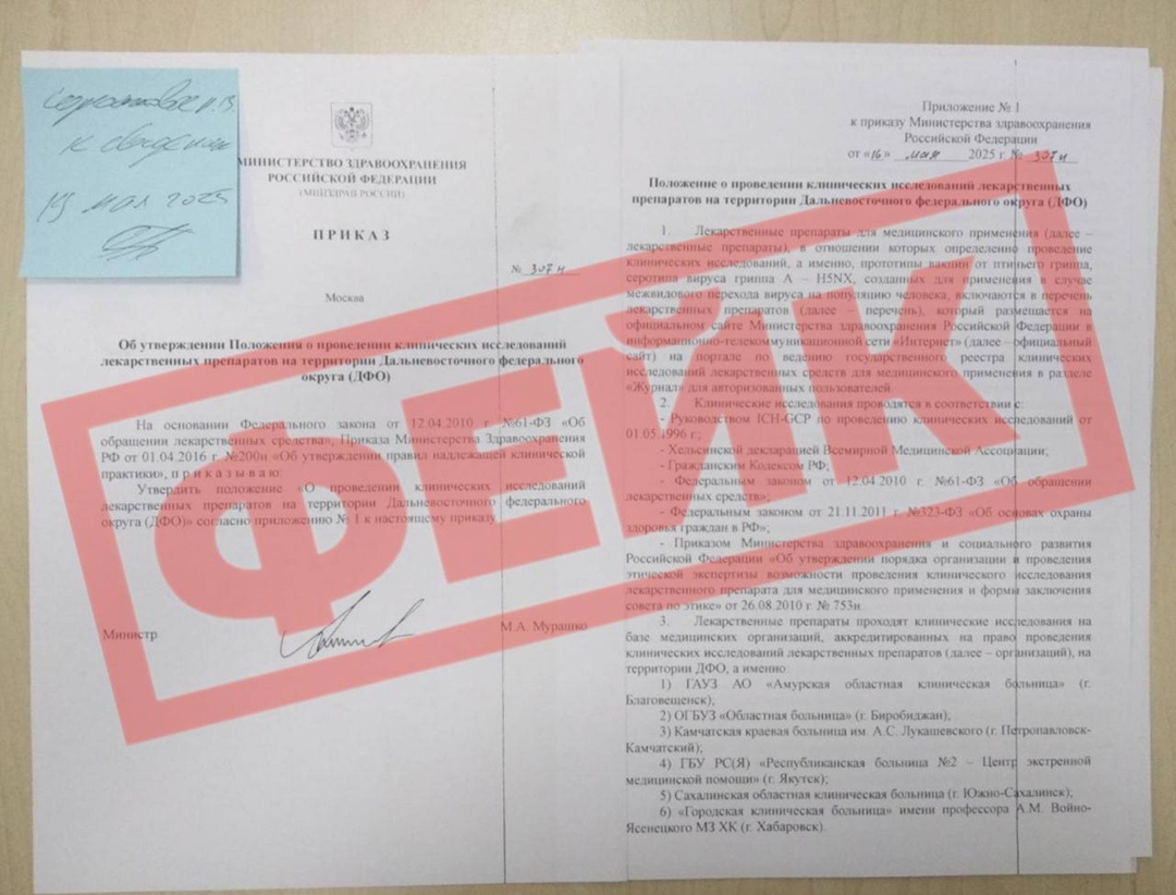 В социальных сетях активно распространяется ложная информация о якобы поступившем приказе Минздрава России о проведении клинических исследований лекарственных препаратов на территории Дальневосточного федерального округа. Эта информация вызывает беспокойство среди населения, пишет ИА «Камчатка». Врио министра здравоохранения Камчатского края Олег Мельников заявил, что эта информация не соответствует действительности. В настоящее время не поступало приказов Минздрава РФ о проведении клинических испытаний вакцины от птичьего гриппа на Камчатке. Любые клинические исследования в России проводятся строго в рамках закона, с информированного согласия добровольцев и под контролем экспертов. Рекомендуем получать информацию только из официальных каналов: сайт Минздрава РФ, правительства Камчатского края и официальных СМИ. Просим вас сохранять спокойствие и не поддаваться панике. Не распространяйте непроверенную информацию! Будьте бдительны и проверяйте источники новостей.