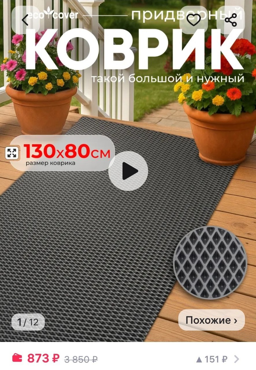 Коврик в прихожую — разбор визуала и нейромаркетинг в действии Рассмотрим карточку коврика для обуви. Есть сильные моменты, но есть и такие, которые требуют доработки для повышения конверсии. --- ✅ Что зашло: 🎥 1. Видео-презентация — Есть подробная видеопрезентация товара — большой плюс! — Показываются все важные аспекты использования коврика, что помогает закрыть основные возражения покупателя. — Дополнительно есть текстовое пояснение к видео — это помогает более глубоко воспринимать информацию. 🧠 Нейромаркетинг: Видео привлекает внимание и стимулирует действие, увеличивая вовлечённость на 30–40%. Но если видео низкого качества — у покупателя могут возникнуть сомнения в бренде, что снижает конверсию. 🔧 Как поможет UPAKOVANO: Создаём качественные видео-презентации с акцентом на эмоциональное подключение и продающие детали. Это усиливает доверие и увеличивает CTR. --- 🖼 2. Главный слайд — Продукт выделен, размеры видны. — Но яркие цвета на фоне отвлекают внимание от коврика.