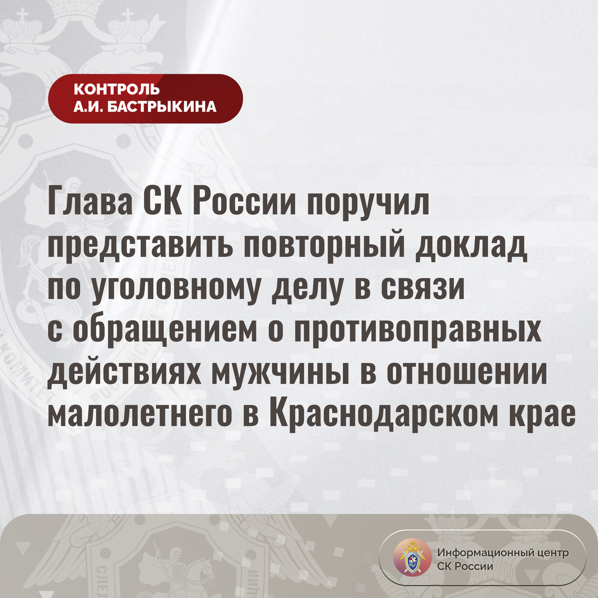 Глава СК России поручил представить повторный доклад по уголовному делу в связи с обращением о противоправных действиях мужчины в отношении малолетнего в Краснодарском крае В Информационный центр СК России обратилась жительница города Новороссийска Краснодарского края, выразив несогласие с ходом установления обстоятельств похищения ее четырехлетнего сына. В августе 2022 года отец ребенка, являющийся гражданином Турецкой Республики, при встрече с женщиной подсыпал ей снотворный лекарственный препарат, после чего забрал мальчика и скрылся в неизвестном направлении. Обращение в органы внутренних дел результатов не принесло. Мужчина смог беспрепятственно вывезти малолетнего за пределы Российской Федерации. В СУ СК России по Краснодарскому краю по данному факту расследуется уголовное дело, по которому ранее А.И. Бастрыкин поручал представить доклад. Председатель Следственного комитета Российской Федерации Александр Иванович Бастрыкин поручил руководителю СУ СК России по Краснодарскому краю