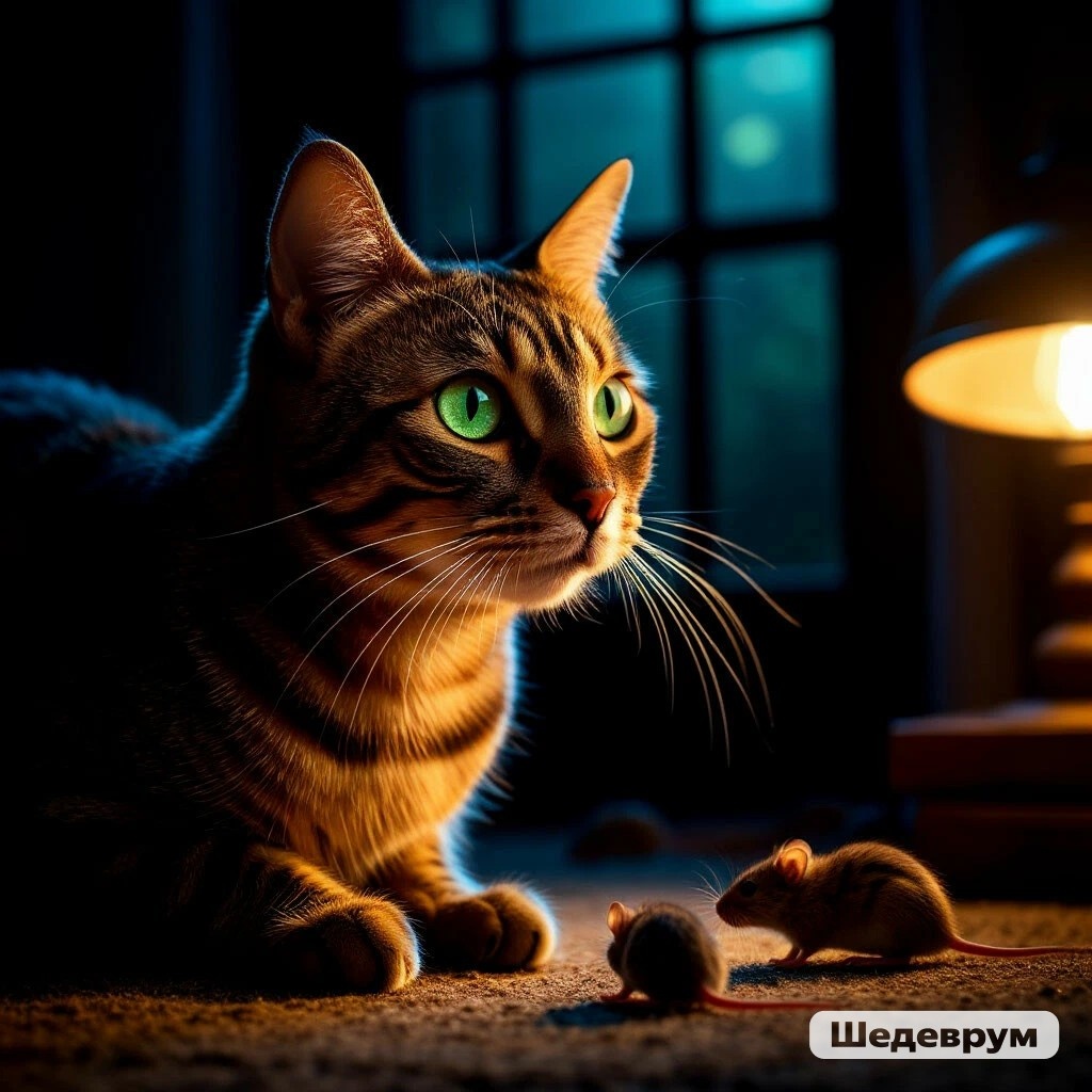 Кошка хорошо видит в темноте благодаря нескольким уникальным особенностям строения её глаз: ### 1. **Большое количество палочек в сетчатке** - Палочки – это фоторецепторы, отвечающие за зрение при слабом освещении. У кошек их значительно больше, чем колбочек (клеток, отвечающих за цветовосприятие и детализацию). - Это позволяет им улавливать даже минимальные световые сигналы. ### 2. **Тапетум (зеркальный слой за сетчаткой)** - За сетчаткой у кошек есть особый слой – **тапетум**, который отражает свет обратно на фоторецепторы, усиливая его эффект. - Именно из-за тапетума кошачьи глаза светятся в темноте, когда на них попадает луч света. ### 3. **Большие зрачки и эллиптическая форма глаза** - Зрачки кошек могут сильно расширяться в темноте, пропуская максимум света. - Форма их глаз (более выпуклая роговица и крупный хрусталик) также помогает фокусировать слабый свет. ### 4. **Высокая светочувствительность** - Кошки видят при освещении, **в 6–8 раз