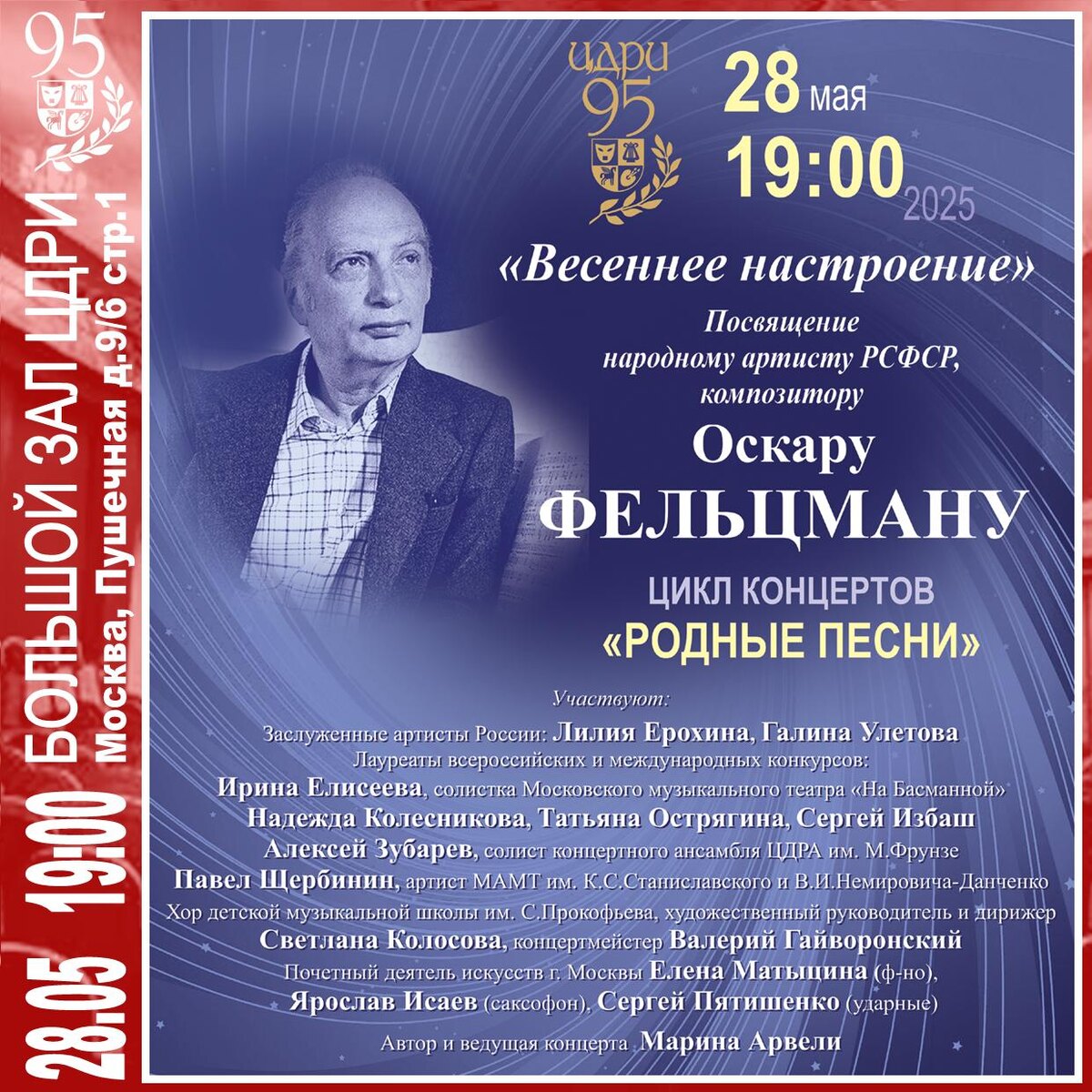 Цикл концертов «Родные песни» Посвящение народному артисту РСФСР, композитору Оскару Борисовичу Фельцману В майском концерте «Весеннее настроение» зрителей ждут многочисленные лирические произведения композитора Оскара Фельцмана из цикла «С любовью к женщине», о гордой и красивой любви, о преданности. Лирика Расула Гамзатова дала прекрасный материал для композиторского творчества Оскара Борисовича. В музыке Фельцмана звучала и тема подвига. В программе песня-баллада «Огромное небо» на стихи Р. Рождественского, рассказывающая о подлинном событии. «Песня — это отклик на нашу жизнь. Душевный и непосредственный рассказ о переживаниях человека. Замечательная возможность общения с миллионами людей разных возрастов и профессий. Важно почувствовать, какую песню ты должен написать и какую песню ждут от тебя, для кого песенное искусство становится в жизни необходимым», — рассуждал Оскар Фельцман. Все эти песни живут ср