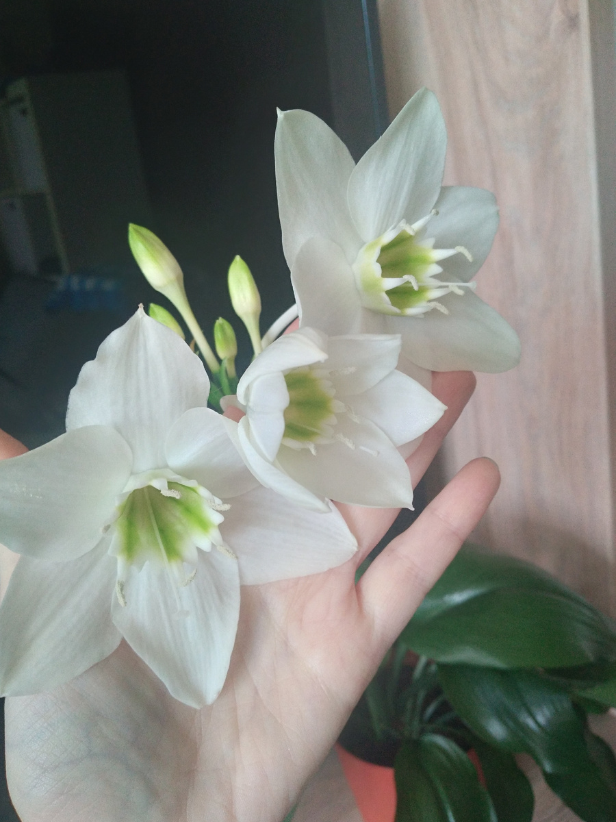 Здравствуйте, у меня опять зацвел эухарис)), хотя амазонская лилия звучит романтичнее и даже загадочнее. А на мой взгляд цветок больше похож на нарцисс.