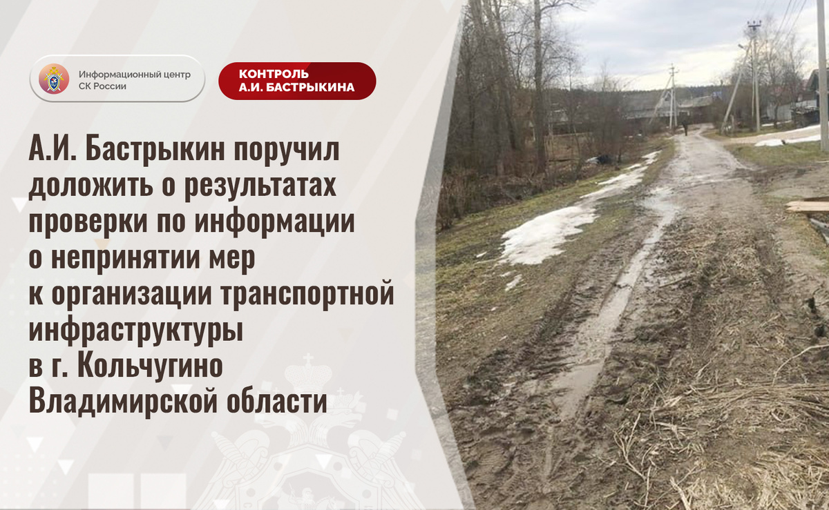 А.И. Бастрыкин поручил доложить о результатах проверки по информации о непринятии мер к организации транспортной инфраструктуры в г. Кольчугино Владимирской области В сети Интернет сообщается о непринятии мер к организации транспортной инфраструктуры в городе Кольчугино Владимирской области. Более восьми лет участок автодороги от трассы «Колокша – Кольчугино – Александров – Верхние Дворики» находится в непригодном состоянии: асфальтовое покрытие отсутствует, на поверхности имеются многочисленные ямы и колеи, грунтовое полотно при выпадении осадков и таянии снега размывается. В результате проезд транспортных средств к домовладениям затруднен. Многочисленные обращения местных жителей результатов не принесли, мер к проведению ремонтных работ не принимается. В СУ СК России по Владимирской области начата процессуальная проверка. Председатель Следственного комитета Российской Федерации Александр Иванович Бастрыкин поручил руководителю СУ СК России по Владимирской области Артему Александрович
