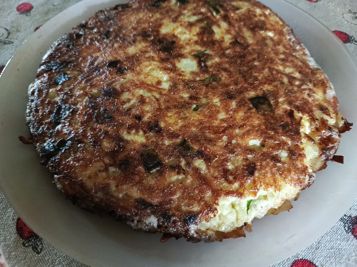 Затем берем тарелку, аккуратно переворачиваем лепешку, и обратно отправляем на сковороду другой стороной.