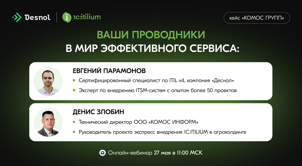 Агрохолдинг «КОМОС ГРУПП» выстроил работу IT-службы всего за месяц! 📌 Как это выглядит в цифрах: Хотите также? Тогда встречаемся на вебинаре уже в следующий вторник 27 мая в 11:00 (МСК). 👨🏻💻 Приглашенный эксперт — Денис Злобин, технический директор «КОМОС ИНФОРМ» расскажет, как пройти путь от хаоса в заявках до системы с ITSM подходом на реальном примере. Мы сразу запустились на всю компанию, а это более 200 IT-специалистов, которые обрабатывают заявки от 13 000 сотрудников холдинга. Система не просто работает, она уже дает нам аналитические данные для принятия решений ✅ Бонус для всех зарегистрированных участников вебинара — чек-лист для экспресс-аудита вашей IT-поддержки, который поможет выявить слабые места и точки роста по 20 ключевым параметрам за 10 минут. Чтобы получить чек-лист и доступ ко всем материалам — зарегистрируйтесь на вебинар прямо сейчас. Это займёт не больше минуты и откроет вам доступ к практическим инструментам, которые уже помогли другим компаниям повысить э