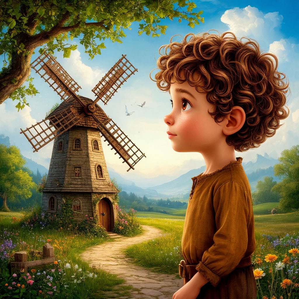 Утром Луми проснулся от лёгкого дуновения ветра, который словно гладил его щёку, напевая утреннюю песенку: «шшш... фууу... ззз...». Он открыл глаза, потянулся и вышел из пещеры, где его уже ждал новый друг Брис, весёлый мальчик из Страны Ветров. — Пойдём! Сегодня ты услышишь, как поют крылья Ветряной Мельницы, — сказал он и кивнул в сторону. Они долго шли по холмам, слушая шепот ветров. Луми подставлял ладошки и угадывал: этот ветер — озорной, тот — сонный, а вот тот — будто шуршит осенними листьями. Наконец они подошли к высокой мельнице. Её деревянные крылья мягко крутились, и с каждым поворотом раздавался звук: «крууу... фуух... жжж...» — Подойди ближе, — сказал Брис. — Упрись ухом в мельничную дверь и внимательно прислушайся. Луми подошел к двери и начал внимательно но слушать. И вдруг — правда! Он услышал голоса. Тихие, будто далёкие: — «Добро пожаловать, маленький путник… Ты добрый. Ты умеешь слушать…» — «Когда-нибудь ты расскажешь миру свою сказку…» Луми замер. Казалось, мель