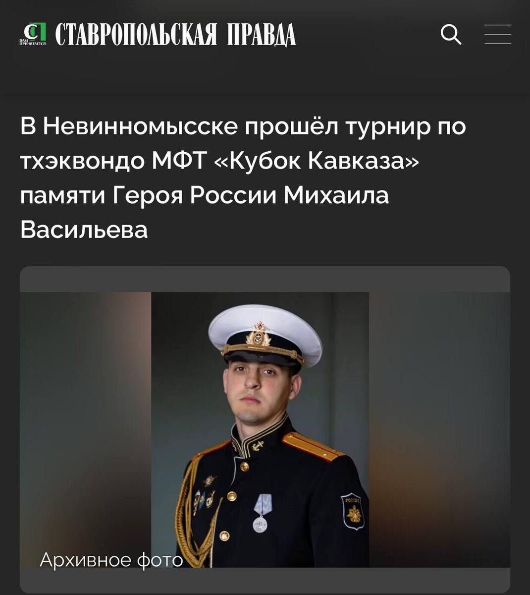 В Невинномысске прошёл турнир по тхэквондо МФТ «Кубок Кавказа» памяти Героя России Михаила Васильева «Герои не умирают – они уходят в бессмертие». Это изречение стало негласным девизом Всероссийских соревнований по тхэквондо МФТ «Кубок Кавказа», прошедших в спортивно-культурном комплексе «Олимп» Невинномысска. Турнир был посвящен памяти нашего земляка, участника специальной военной операции Героя России Михаила Васильева. Прошедшие состязания стали первыми со всероссийским статусом для краевого тхэквондо МФТ. Командир роты морской пехоты Каспийской флотилии Михаил Васильев родом из Кировского округа. Профессиональный военный, он окончил Рязанское гвардейское высшее воздушно-десантное командное училище. Кавалер трех орденов Мужества, награжден медалью «За отвагу», медалью ордена «За заслуги перед Отечеством» II степени. В октябре 2023 года, выполняя боевую задачу в ходе специальной военной операции, личный состав роты под руководством старшего лейтенанта Михаила Васильева отразил нес